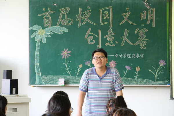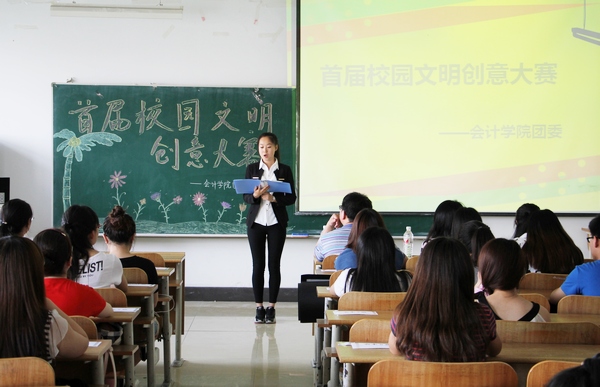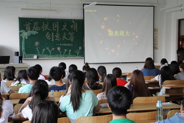 2015年6月18日,哈尔滨商业大学会计学院首届校园文明创意大赛在大家的翘首期盼中如期举行。本次活动由哈尔滨商业大学会计学院团委主办,外联部承办。本次活动旨在弘扬社会主义核心价值观,践行校训“求真至善,修德允能”,鼓励大学生保护环境,关爱他人,拥有创新意识。出席本次活动的嘉宾有会计学院学生团委书记、2012级辅导员王博老师,2014级辅导员奚迪老师、陆黎敏老师。