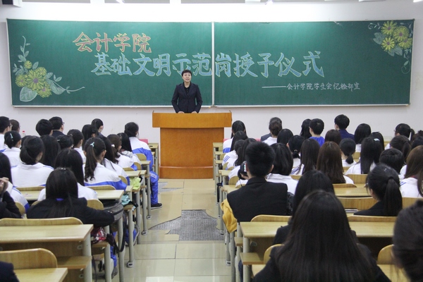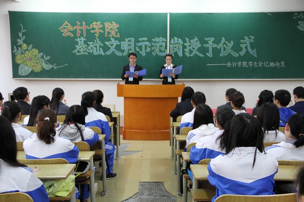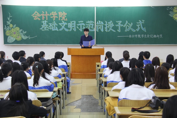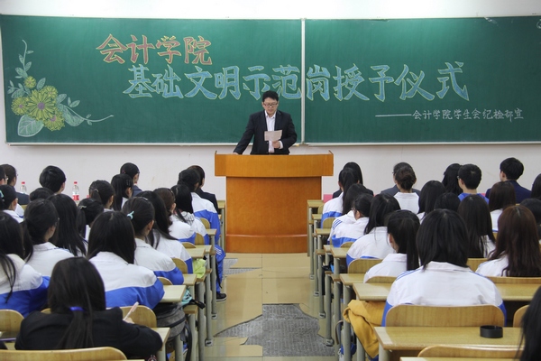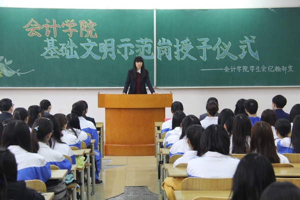 为了进一步增强大学生文明素质教育,提升大学生的思想道德水平和文化素养,2015年4月9日下午4点30分,会计学院于4403教室举办了基础文明示范岗授予仪式即“基础文明建设月”启动仪式。莅临本次仪式的嘉宾有会计学院党总支书记陈慧华教授,党总支副书记刘天副教授,院团委书记、2012级辅导员王博老师,2011级辅导员白璐老师,2013级辅导员韩雪老师、李慧铭老师,2014级辅导员陆黎敏老师、奚迪老师,会计学院学生会主席王一钧,到场的还有2014级文明示范岗优秀代表及学生会纪检部全体成员。此次活动由会计学院学生会主办、学生会纪检部承办,仪式在掌声中拉开帷幕。