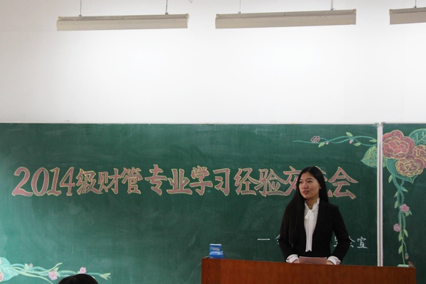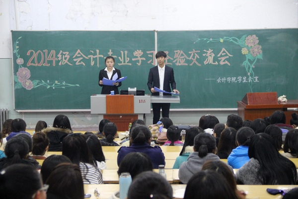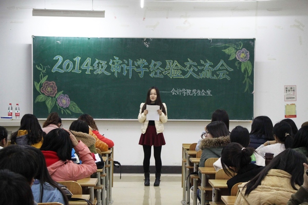 为提升学生的专业素养,使学生们尽快适应大学学习生活,由会计学院学生会主办、学习部承办的会计学院2014级专业学习经验交流会于2014年10月28日至11月10日在东2105、主1411、主1303等教室隆重举行。本届交流会历时14天,共涉及我院三个专业七个方向,分别是会计学专业、财务管理专业、审计学专业、国际会计方向、注册会计方向、加拿大CPA方向和ACCA方向。会计学院2014级辅导员奚迪老师、陆黎敏老师出席了各场次的经验交流会,出席现场的嘉宾还有各专业优秀学生代表和“挑战杯”创新创业大赛优秀代表,他们是财务管理2011级宋宇坤、会计学2011级朱槿、国际会计2012级于鹏瑶、刘影、注册会计2011级冯百阳、加拿大CPA 2010级李欣彤、审计学2011级赵昕、ACCA 2012级季佳宁和挑战杯获奖学生2012级王博、栾春晓。本届大会在学生会学习部部长的主持下顺利进行: