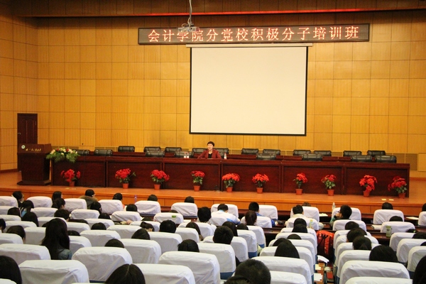 会计学院分党校于2014年5月16日至5月21日在专家公寓举行四次积极分子培训班。主讲老师分别有:会计学院党总支书记陈慧华教授,管理学院书记谭士元老师,马克思主义学院老师武立波老师,宣传部部长李德学老师。参加此次培训班的同学有会计学院全体入党积极分子。