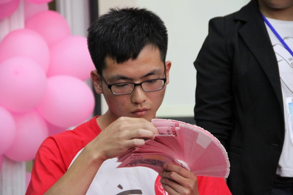 在点钞大赛中,各位辅导员老师,学生会主席团成员及各部部长纷纷上台亲身感受点钞。随后,选手参加的干扰性点钞环节,更是将现场的气氛推到了高潮,选手们精彩的回答与点钞技术让现场的观众赞叹不已。经过三轮比赛,2012级会中21班胡明炎、2013级CGA徐远达、2013级会本5班张萌分获比赛前三名,其他选手获得优秀奖。