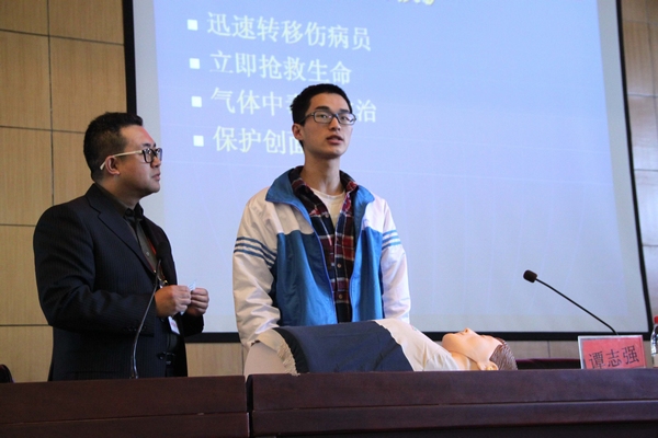 随着培训的正式开始,大家又以热烈的掌声迎来了谭教授的上场,他利用多媒体教案、人体模型等多种方式讲述救护概念以及方法。首先他用数个例子指出近些年来火灾的发生次数的变化,并讲解火灾中可以致人死亡的主要因素。与之相应,他还向我们介绍了家中应备的几样救灾物品,如手电筒、小型灭火器和防烟面罩等。在让同学们认识到火灾的严重性的同时,谭教授还指导我们在应对火灾之时,需要拨打火警电话并采取相应的防护措施,如匍匐在地贴近墙角,切不可横冲直撞。而在学校寝室,我们更应该具备防火意识,比如寝室的插排、电线不能连接特别多的电器,还要注意时常关闭总电源以防止灾难发生。之后谭教授又采用实际操作介绍应急救护知识。在培训中,同学们积极的上台进行互动,并纷纷感叹学习紧急救护的必要性。
