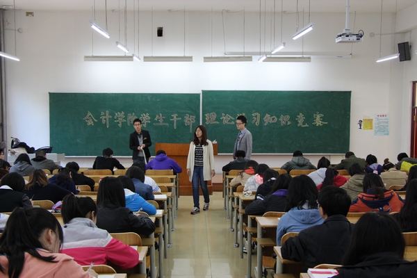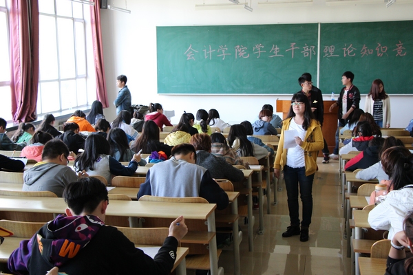 为了加强学生干部的理论学习,帮助学生干部了解十八大精神,树立社会主义核心价值观,会计学院于2014年5月8日下午16:20分组织全体学生干部在4号教学楼进行会计学院学生干部理论知识竞赛预赛。