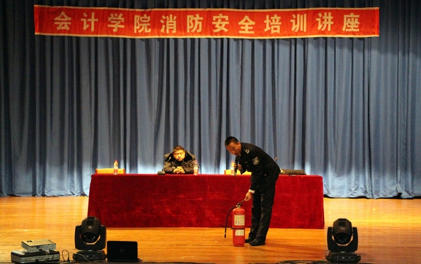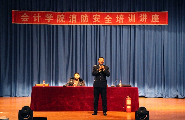 为增强学生的安全意识和责任意识,正确地预防和应对火灾,2013年11月19日17点,会计学院在校保卫处的大力支持下诚邀政安防火知识宣传中心的王岩教官在东区大礼堂为学院学生举行了消防安全知识的专题讲座。莅临的嘉宾有校保卫处副处长徐勇老师、会计学院党总支书记陈慧华教授,会计学院团委书记、12级辅导员王博老师,13级辅导员李慧铭老师。会计学院13级全体学生,11、12级的学生干部和寝室长参加了此次讲座。