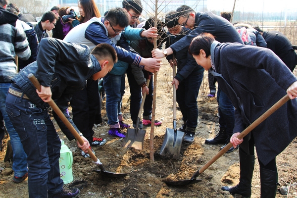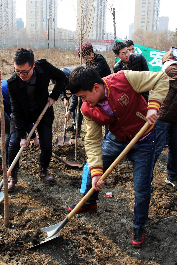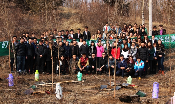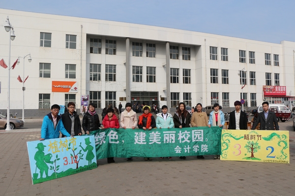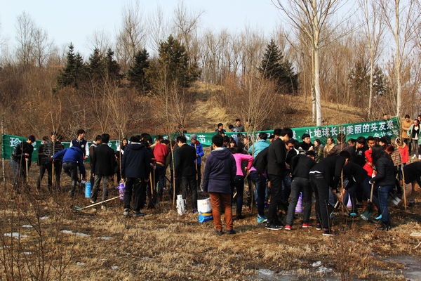 活动现场院学生会实践部的部长和青协蓝梦的成员们,挂起了宣传条幅,“珍爱绿色,珍爱我们共同的家园”、“植树节,你也贡献自己的力量,让地球长出美丽的头发”。中午12:20,在陈书记对同学们充满希冀的讲话后,植树活动正式开始了。大家手拿树苗、水壶、铁锹,分工明确,配合默契,每个人都尽力挖好每一个坑、培好每一锹土、植好每一株树。在学院领导、老师和同学们的共同努力下,一颗颗树苗已经伫立在场地中。虽然辛苦,可是大家觉得一切都是值得的。活动最后,学院领导、老师和同学们进行合影留念,为此次活动画上了圆满地句号。