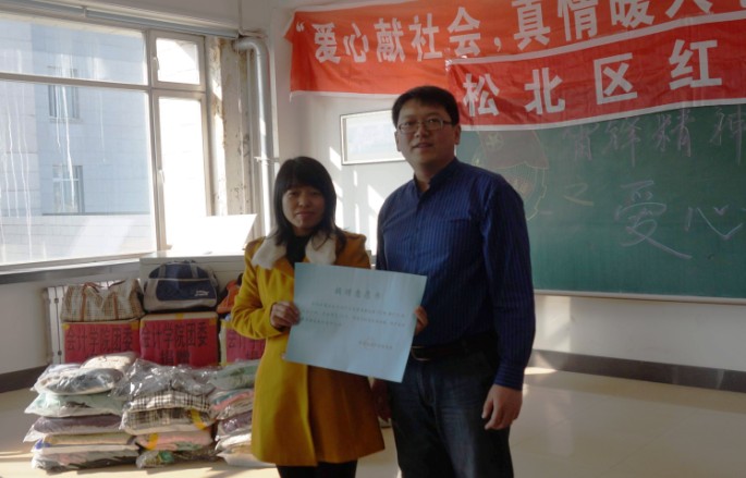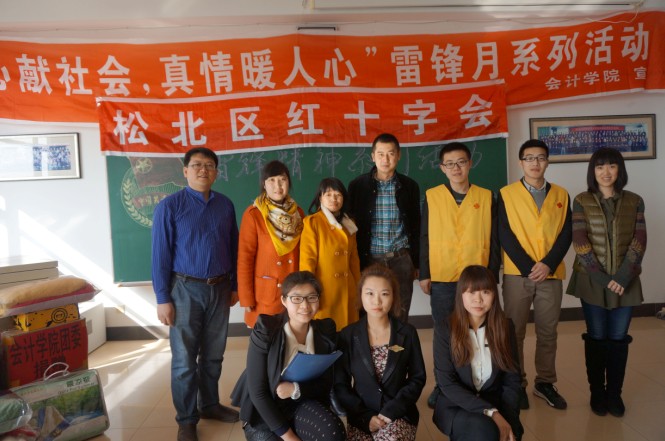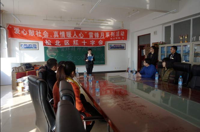 为传承雷锋精神,发扬无私奉和关爱互助精神,搭建帮扶平台,在松北区红十字会的帮助下,会计学院团委与松北区乐业镇团委建立了联系,并于2014年3月14日在会计学院1405会议室举行了“关爱乐业镇贫困家庭子女和留守儿童爱心捐赠仪式”。出席本次活动的领导有,松北区红十字会代表、卫生局副局长高立夫局长;乐业镇团委书记郑双英书记;会计学院党总支副书记刘天副教授;会计学院团委书记、12级辅导员王博老师。