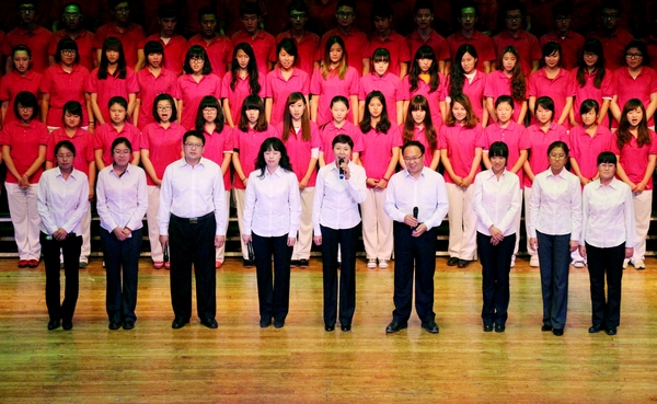 舞起乐明,《给力青春》以活泼可爱的面貌呈现在我们面前,他们欢快的舞姿与音乐的完美融合,瞬间点燃了在场观众的热情。晚会正式开始,主持人介绍莅临本场晚会的嘉宾:会计学院党总支书记陈慧华教授;院长张林教授;副院长张劲松教授;党总支副书记刘天副教授;团委书记、2012级辅导员王博老师;团委副书记辅导员郑磊老师;2013级辅导员韩雪老师、李慧铭老师;辅导员奚迪老师、陆黎敏老师。之后,学院领导班子成员集体上台为国庆、为新生致辞。