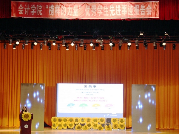 2013年10月13日下午1:30,由会计学院团委主办的会计学院“榜样的力量”优秀学生先进事迹报告会在B区大礼堂举行。学院2013级辅导员李慧铭老师,学院学生团委书记王美惠同学出席了本次报告会,800余名大一新生聆听了报告会。报告会由2013级辅导员李慧铭老师主持。