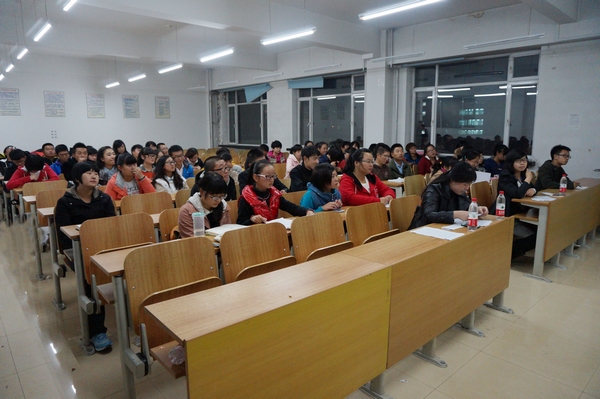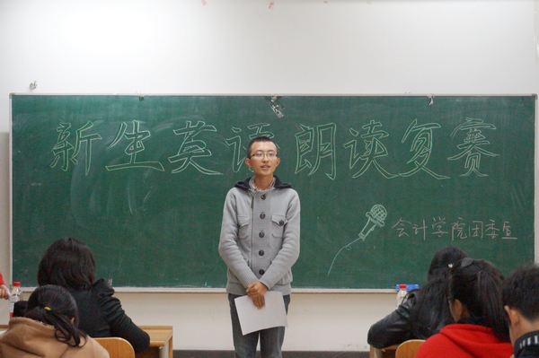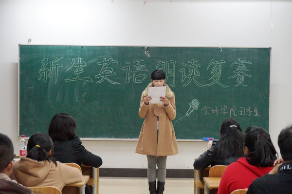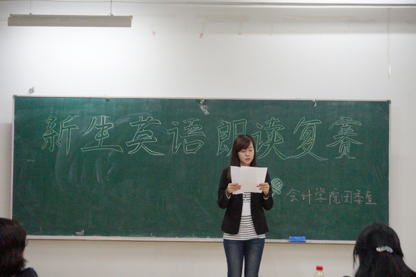 为了检验大一新生的英语水平、提升同学们对英语的兴趣,会计学院学生团委于2013年10月11日在1411教室举行了新生英语朗读复赛。参加本场复赛的是从初赛中脱颖而出的42名同学。赵秋龄老师担任本次比赛的评委。
