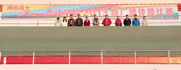 会计学院为了培养大学生德、智、体、美全面发展,继承学院在校运动会上连续获得广播体操比赛一等奖的光荣传统,同时为了检验2013级新生入学后早操的成果,我院在2013年10月31日下午3点30分在A区体育场进行了“拥抱商大,梦想启航”广播体操比赛。出席本次比赛的嘉宾有会计学院党总支书记陈慧华教授,会计学院团委书记、12级辅导员王博老师,会计学院2013级辅导员韩雪老师、李慧铭老师,会计学院学生会体育部部长周久贺以及2013级的导生们。