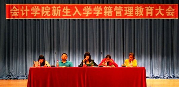 2013年9月2日下午5点,会计学院在东区大礼堂举行了新生学籍管理教育大会,出席本次大会的有:会计学院党总支副书记刘天副教授;会计学院团委书记、2012级辅导员王博老师;2011级辅导员白璐老师;2013级辅导员李慧铭老师和韩雪老师。