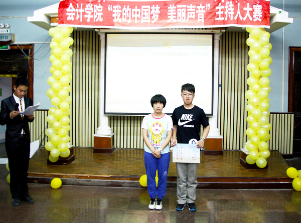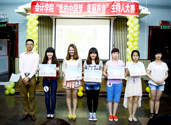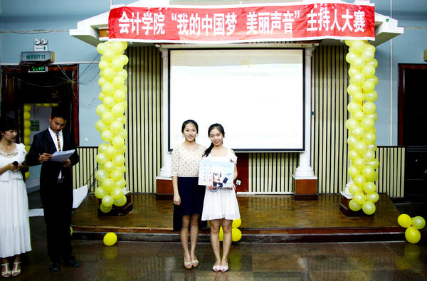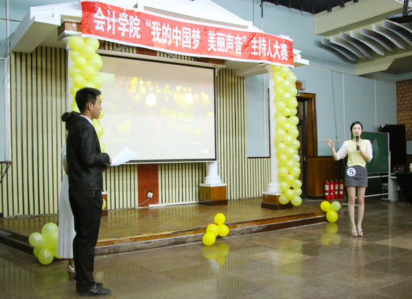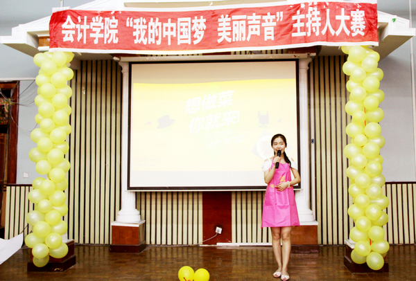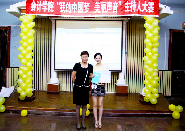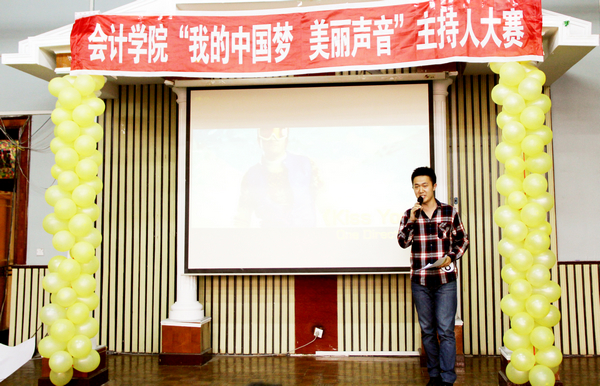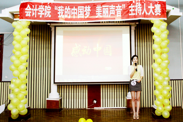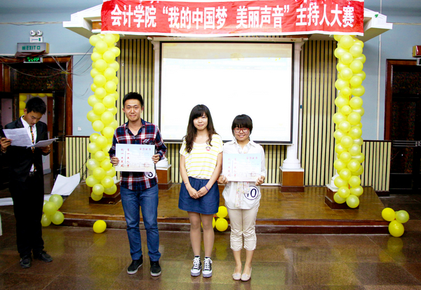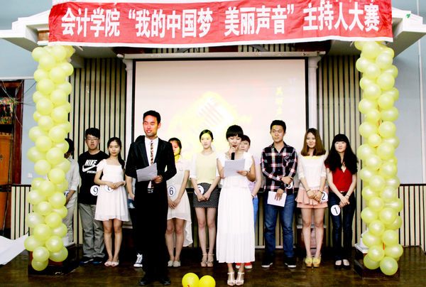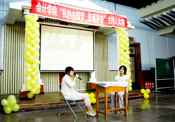 2013年5月26日下午4点30分,由会计学院学生会播音主持部举办的会计学院首届主持人大赛在B区多功能厅举行。大赛组委会特邀会计学院党总支书记陈慧华教授、会计学院学生会行政中心主任王宇航同学、传媒中心主任魏博同学、文艺中心主任崔晓洁同学和哈尔滨商业大学传媒中心北校区播音部部长金璐同学、南校区播音部部长王子睿同学作为本次比赛的评委。