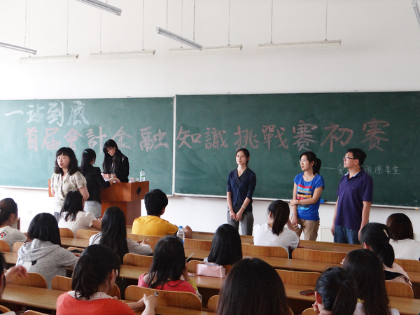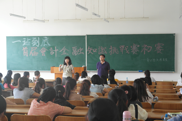 为加强学生间的信息传递与知识互补,提高我院各年级同学对专业知识学习的热情,巩固专业知识基础,提高会计专业上岗技能,拓展同学们的知识面,倡导“进步,创新,勇拼”的大学精神,打造会计学院品牌活动,我院学生团委于2013年5月30日举办了“一站到底”会计学院首届会计金融知识挑战赛初赛。