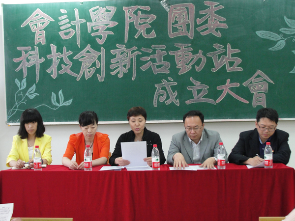 2013年6月3日晚4:30,会计学院团委学生科技创新活动站成立大会在1411教室召开。出席本次大会的有党总支书记陈慧华教授,会计学院院长张林教授,副院长张劲松教授,党总支副书记刘天副教授以及团委书记2012级辅导员王博老师。会计学院团委学生科技创新活动站成员和学生团委组织部全体成员参加了本次会议。