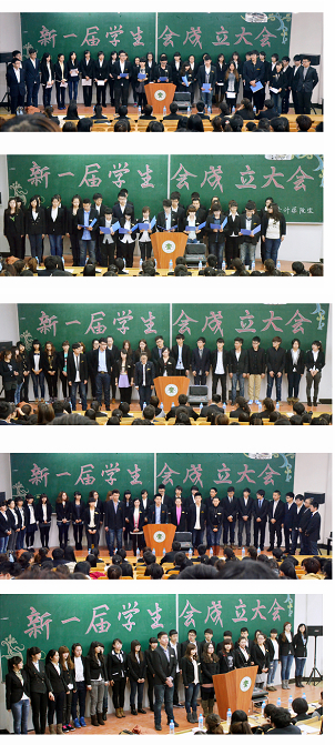 在掌声的伴随下大会进入的第三环节:由主席团发表讲话。主席团各中心的主任们用一腔热情带领各部门的干事们立下铮铮誓词。不仅表达了对新进成员的鼓舞与支持,也诠释了各部门的职责和决心,相信在陈书记的带领下和全体学生会成员的共同努力下,学生会一定能够更加辉煌。