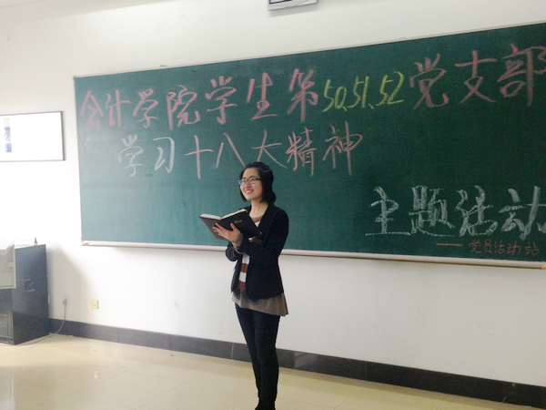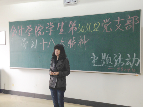 活动第一项,会计学院第52学生党支部支部书记孙天紧紧围绕党的十八大精神——“时代的坐标,前进的方向”,向同学们介绍十八大会议的主要内容和党的发展方针。