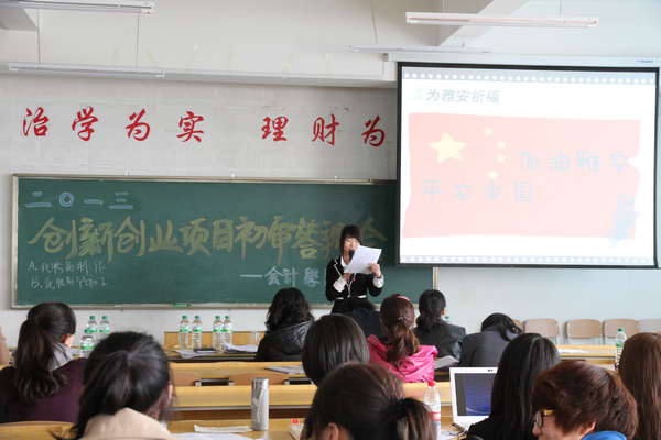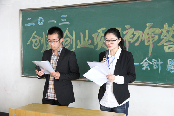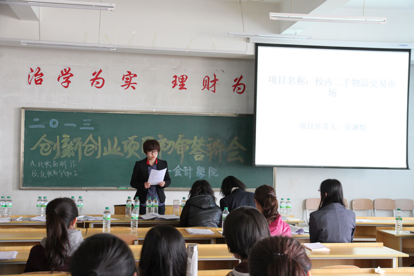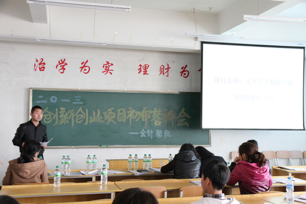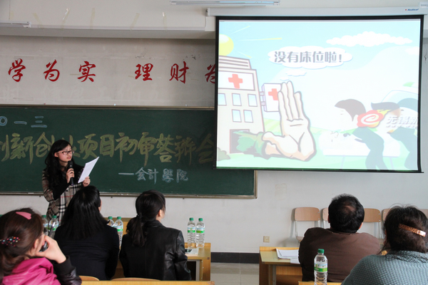 会计学院2013年创新创业项目初审答辩会于4月24日在1413教室召开。出席本次答辩会的评委有会计学院院长张林教授、副院长张劲松教授、副院长徐鹿教授、党总支副书记刘天副教授、唐现杰教授、周航教授、李兆华教授、辅导员王博老师、白璐老师。