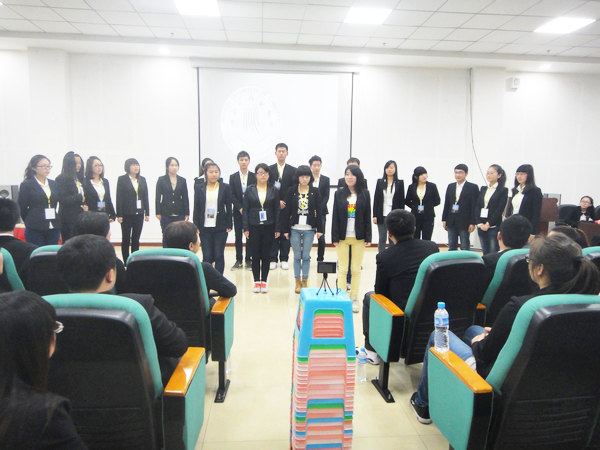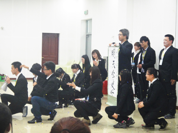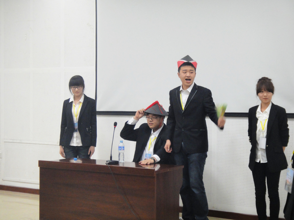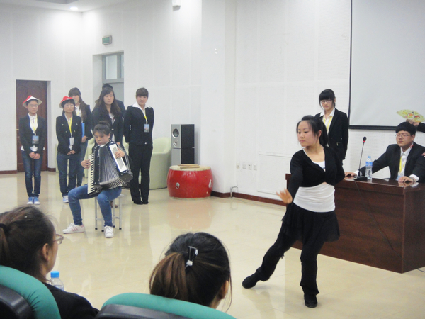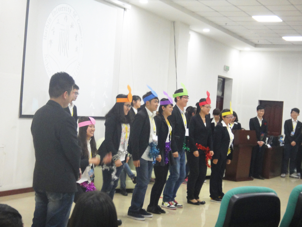 接下来进行的是各部门展示十分精彩,办公室表演了一个发生在古代衙门的故事,表演中涉及到朗诵、三句半、双簧、乐器演奏、伴舞、合唱多种演出形式。档案部在新成员自我介绍后表演了“白雪公主和七个小矮人”的故事。管理部的节目采用红极一时 “非诚勿扰” 的形式,表演的真实形象。奖惩部以学生在校日常生活表现为内容,将奖惩部红白卡发放的职能表现了出来,非常贴近生活。学籍部表演了集体手语合唱,部员们摆出了“心”的队形。宣企部的原创作品以在大学生之中最流行的人人网为链接线索,先后分为三个精彩的小故事。