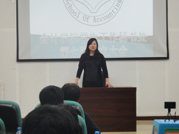 会计学院学生工作秘书处于2013年5月8日下午18时30分,在图书馆一楼报告厅隆重召开成立大会!出席本次大会的嘉宾有会计学院党总支书记陈慧华教授,09级辅导员郑磊老师。