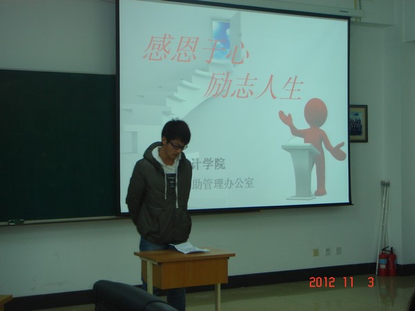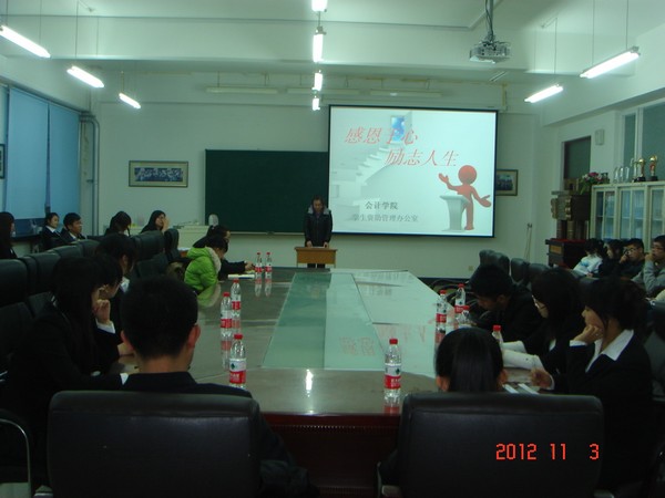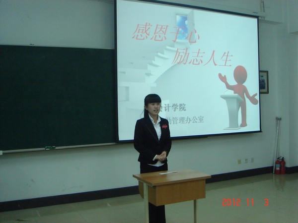 感恩是一种强大的力量,催人奋进,心存感恩,成就励志人生。为响应校学生资助管理中心的号召,推动学生形成感恩诚信的良好风尚,会计学院学生资助管理办公室于2012年11月4日下午三点在教学1号楼1403会议室举办了面向会计学院家庭经济困难学生的以“感恩于心,励志人生”为主题的演讲比赛。为保证比赛专业、公正,特邀哈尔滨商业大学演讲与口才协会培训部部长尹泽华作为专业评委。