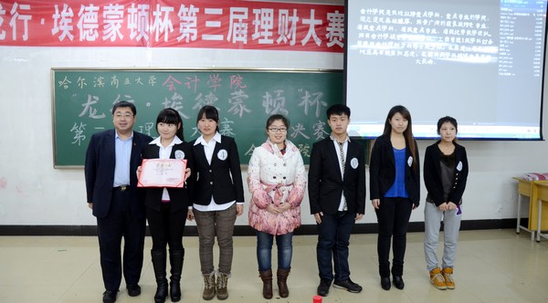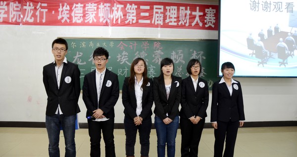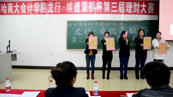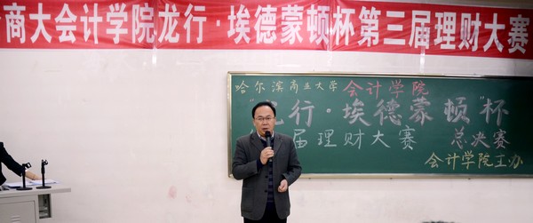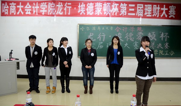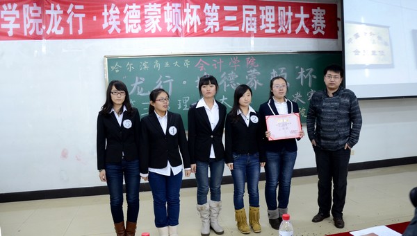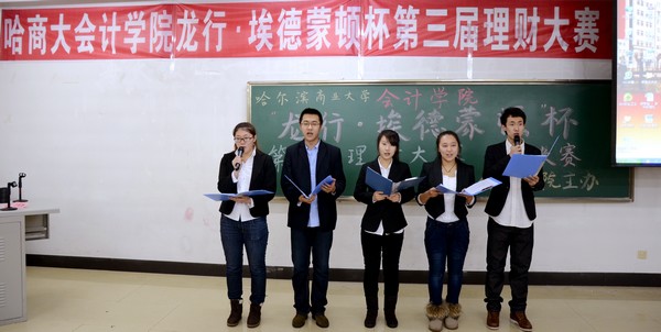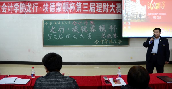 2012年12月3日下午5:30,由会计学院学生会纪检部和龙江银行埃德蒙顿支行共同承办的“中行杯”第三届理财大赛决赛,在1410教室顺利举办。本次大赛到场的嘉宾有会计学院党总支书记陈慧华教授;会计学院院长张林教授;龙江银行埃德蒙顿支行行长助理兼营业部主任刘力刚先生;龙江银行埃德蒙顿支行综合管理部邱晨女士;天津亨利股权投资基金董事、哈尔滨元亨财富投资咨询公司总经理、哈尔滨亚商财经管理学校校长丁健老师。