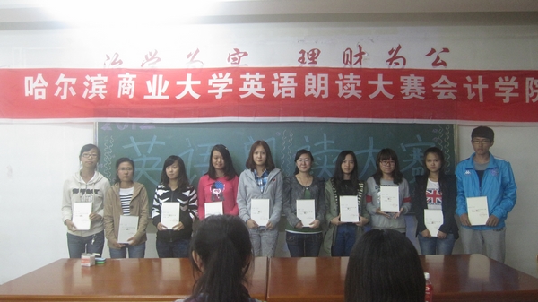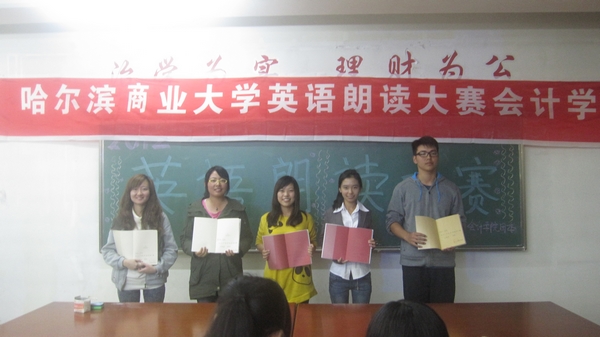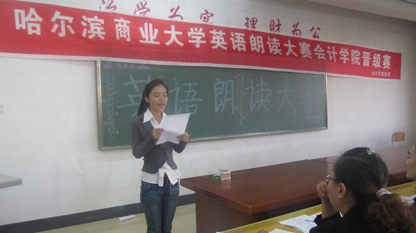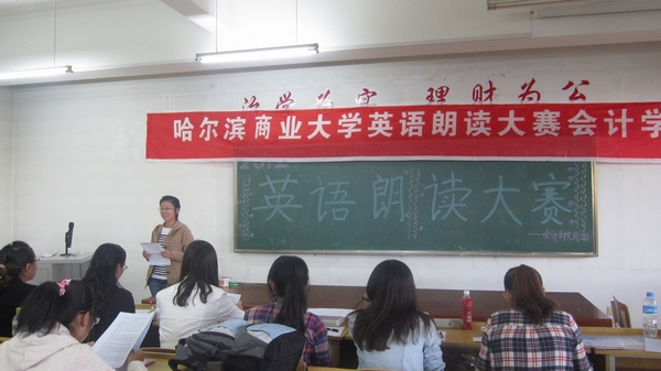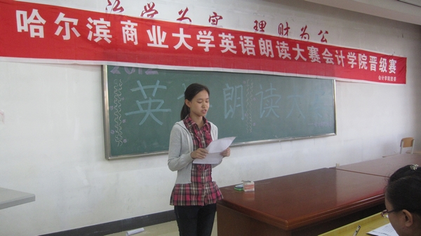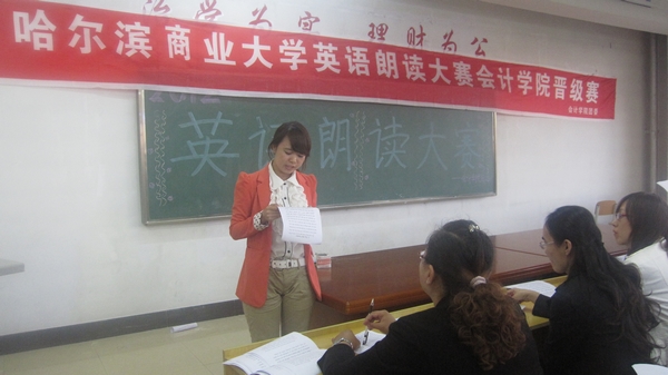 会计学院为了认真贯彻《哈尔滨商业大学新生英语朗读大赛》文件精神,激发广大学生学习英语的兴趣,给同学们创设展示自我的平台,烘托英语学习的氛围,于2012年9月17日晚五点在1410教室举办了英语朗读大赛,本次比赛是由会计学院团委承办,并邀请了外语学院和ACCA的专业英语老师担任本次比赛的评委。
