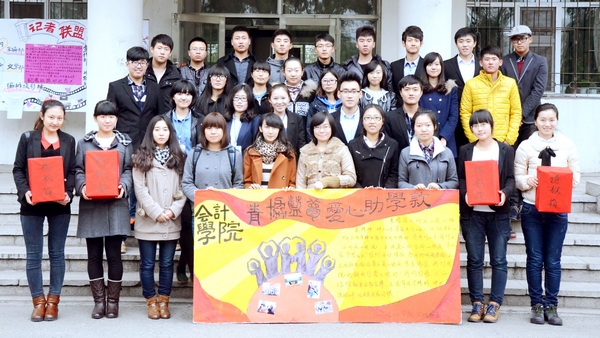 会计学院党总支书记陈慧华教授,院长张林教授,副院长张劲松教授,会计学院团委书记、2012级辅导员王博老师和2011级辅导员白璐老师带领会计学院六大学生组织的负责人率先捐出善款。接着,我院的同学们也积极地奉献出了自己的爱心:5元、10元、50元、100元……一份份爱心伴随着一笔笔捐款流入捐款箱里,每个人都献出了自己的一份绵薄之力。师生们用自己的实际行动诠释了一份奉献,一份感恩。在短短的2天内,就筹得了数千元善款。之后,师生们进行了签字仪式并合影留念。本次捐款活动让同学们懂得了爱心的无价,生命的珍贵。同时也折射出了我院师生身上所具有的助人为乐、无私奉献的良好风貌,树立了高尚的道德情操,为建设和谐学院做出了积极的贡献。