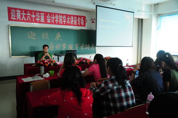 2012年9月7日上午10点10分在哈尔滨商业大学会计学院1410进行了会计学院迎校庆系列学术讲座的第六场,邀请到北京农业发展银行处长杨贺作为本场讲座的嘉宾。会计学院李文教授担任了本场讲座的主持人。杨贺处长就世界经济格局、金融业发展道路等问题为同学们进行了详细的解说,并对同学们的成长之路进行了有益的引导。