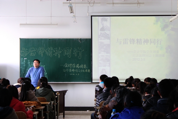 为弘扬雷锋精神、掀起“向雷锋同志学习”热潮,会计学院团委于2012年3月5日中午在1408教室举办了以“与雷锋同志同行”为主题的团活。院团委书记、2008级辅导员王博老师出席了本次活动。
