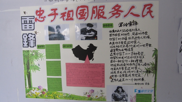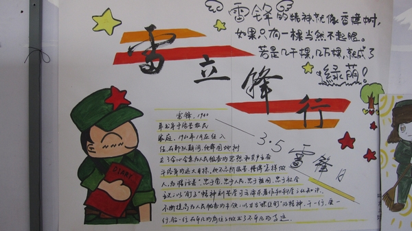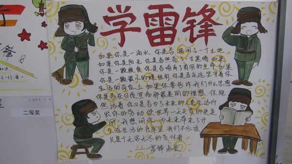 在创作过程中,同学们把对雷锋的崇敬和怀念之情深深地融入作品里,以多样的角度追溯雷锋同志的光辉事迹、展现雷锋同志的光辉形象;用独特的方式赞扬他的“钉子精神”、歌颂他“全心全意为人民服务”的高尚品质。因而同学们的板报作品新颖独特、丰富多彩,既弘扬了雷锋精神,又赋予了时代特征。