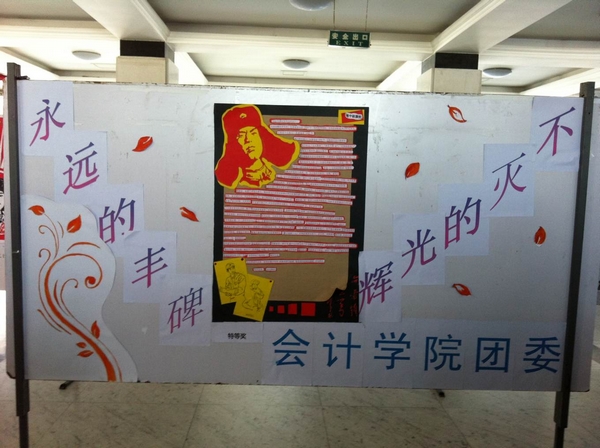 为了进一步弘扬雷锋精神,会计学院学生团委举办了首届校园板报大赛。此次活动以“永远的丰碑,不灭的光辉”为主题,于2012年3月4日至12日一周时间完成了本次大赛作品的征集、评选及展览。此次活动,便得到了同学的积极响应,纷纷报名踊跃参加,培养了同学们的良好行为习惯和道德情操,并在校园中形成了学习雷锋的良好氛围。
