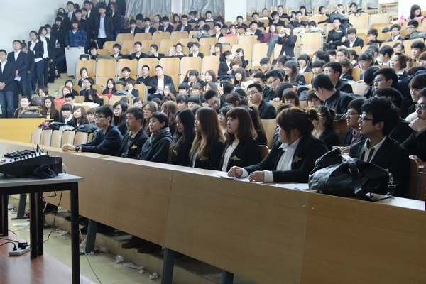 会计学院学生会近500人,他们身着整齐的服装,怀着喜悦的心情参加着自己的盛会。本次大会由会计学院学生会执行主席王瀚雄和常务主席肖玥共同主持。大会第一项为各部门部长带领新干事做自我介绍和团队展示。学生会四大中心的十七个部门依次上台展现了各自的风采,为大家带来了精心准备的节目。管理中心通过精心准备以再现他们工作情况的形式进行了自我介绍,以生动形象的方式表达出了其独特的职能,展示了他们平日严谨认真的工作作风;行政中心则采用了更激昂的形式表达了对学生会美好明天的无限憧憬;文艺中心的同学们则充分地利用了他们的特长,以每个部门特有的表达形式,传递出他们对学生会的热爱之情;传媒中心共同演唱的《相亲相爱》表达了个成员之间的脉脉温情,他们团结协作精神令在场所有人为之动容。