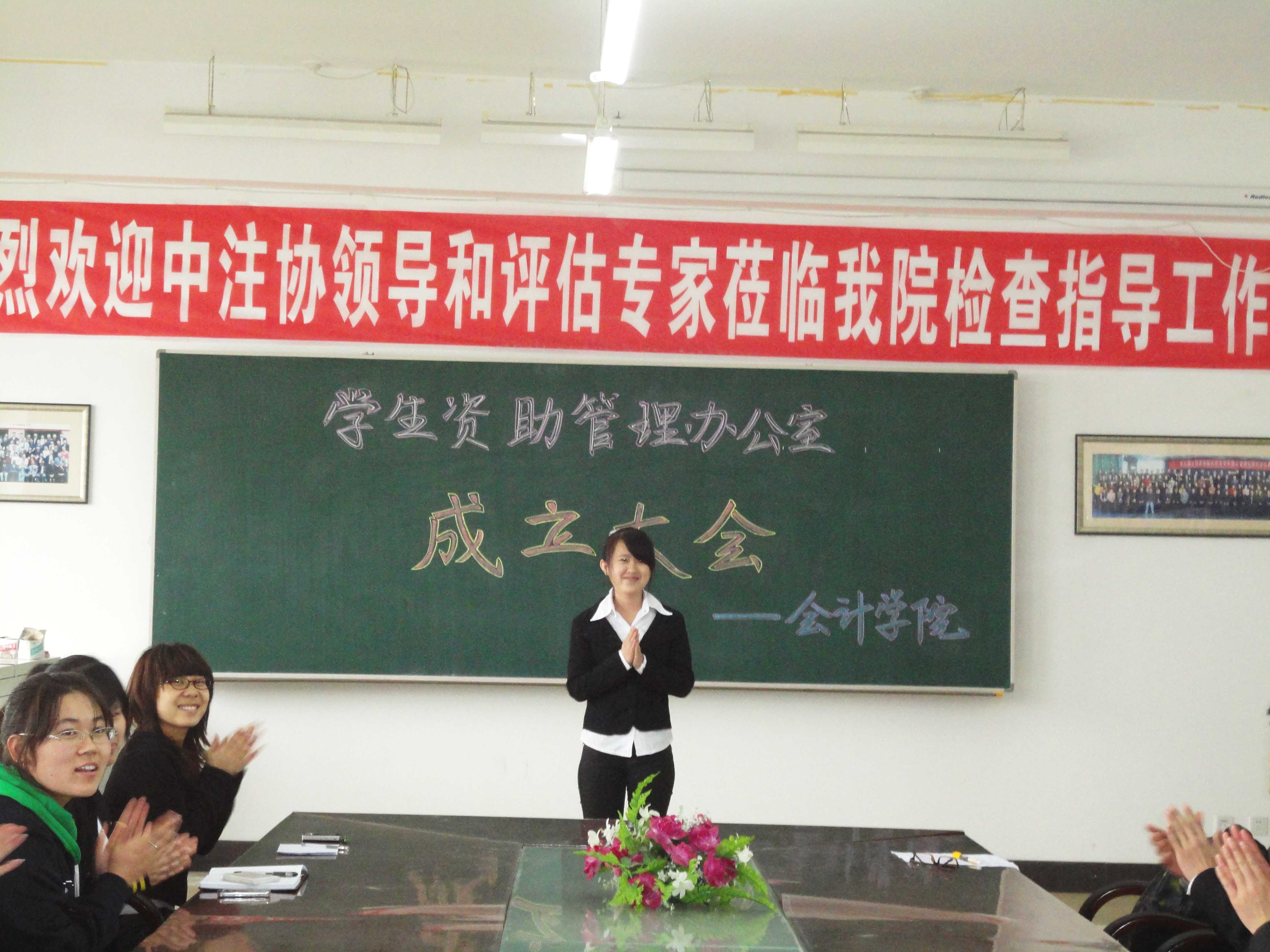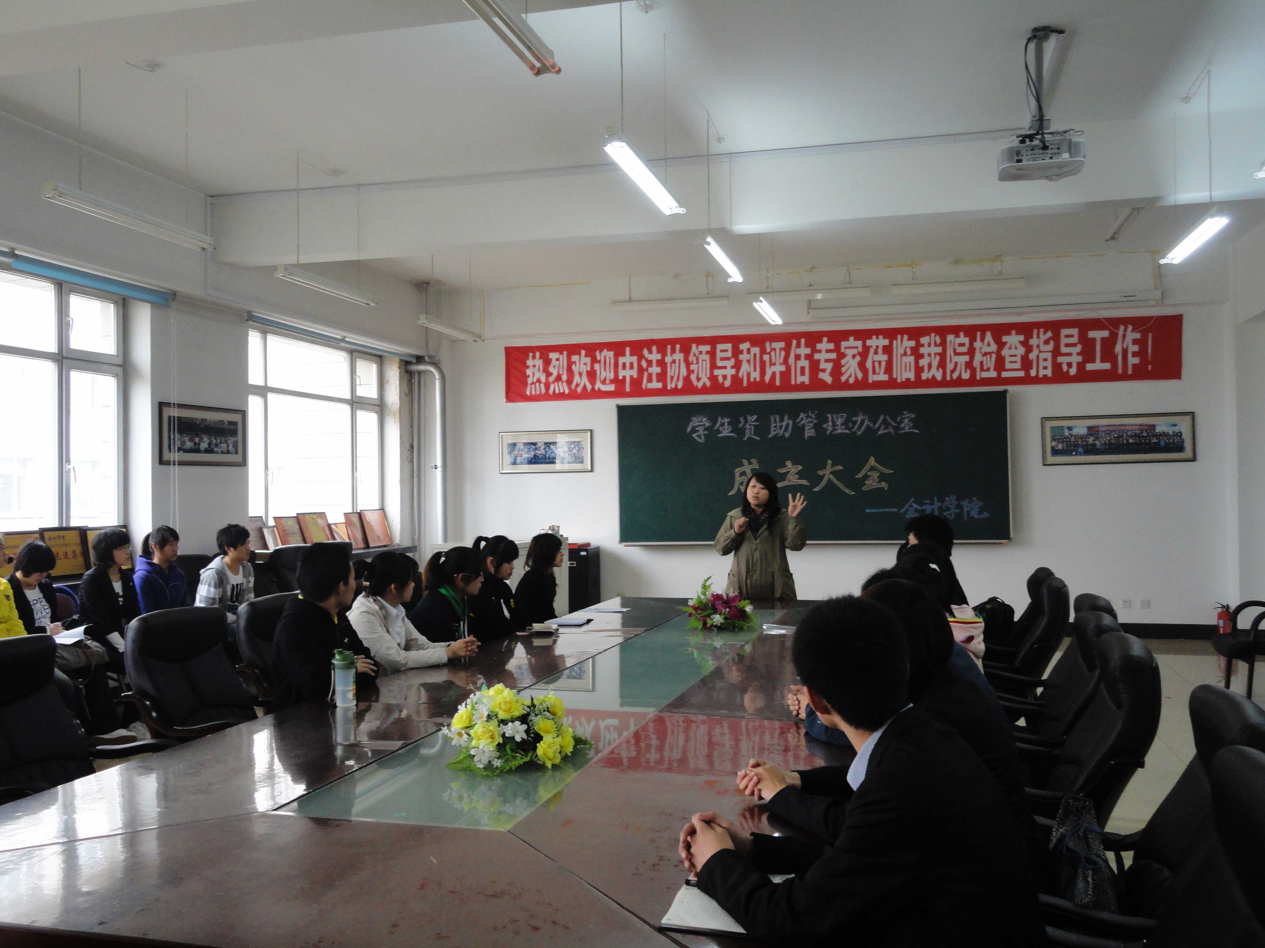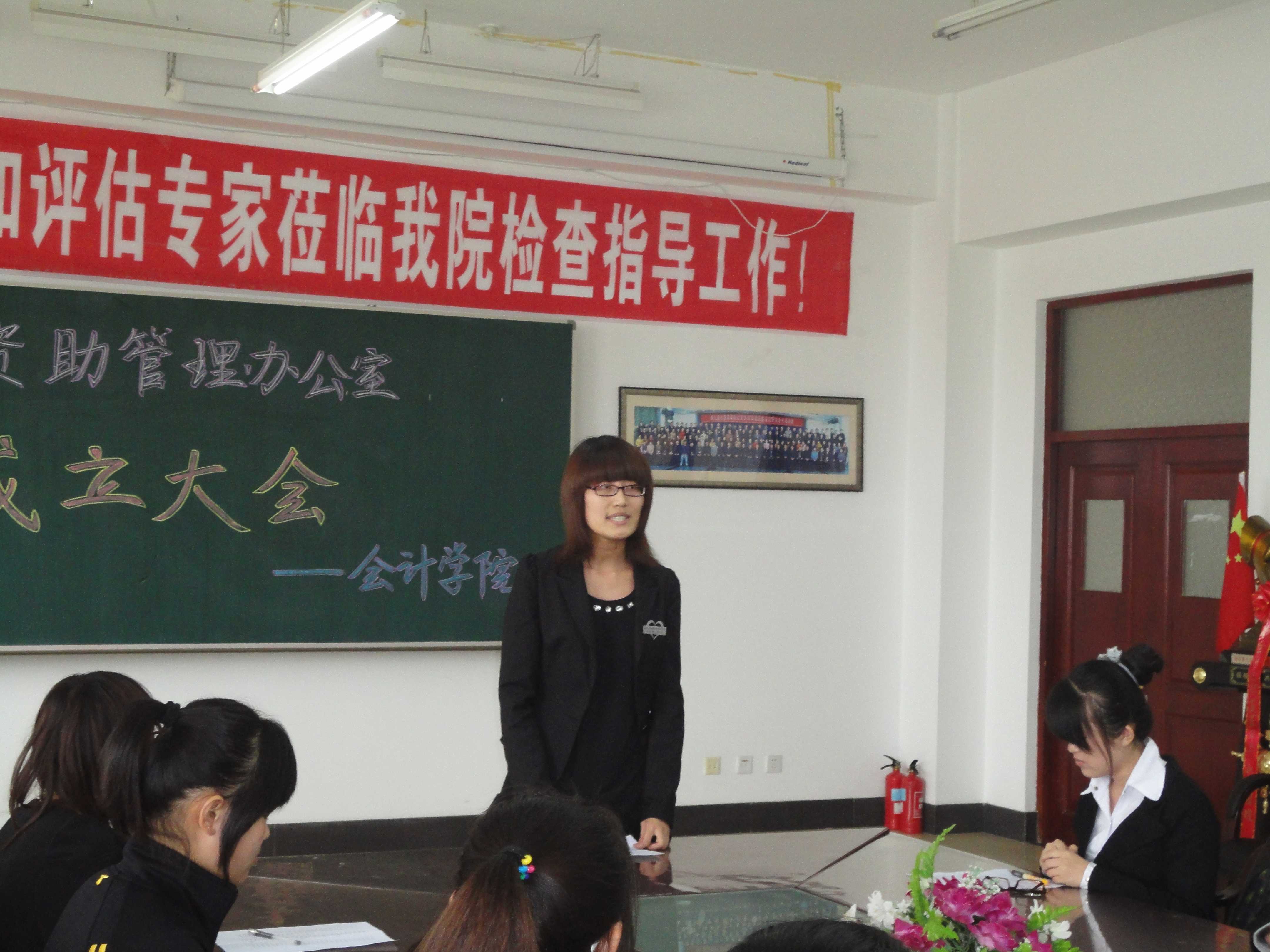 2011年5月6日中午,会计学院学生资助管理办公室在A区1403教室召开了成立大会。党总支副书记赵世杰老师出席会议,办公室主任、副主任、各部负责人及各部部员参加了会议。会议由贷款部部长孟娇主持。