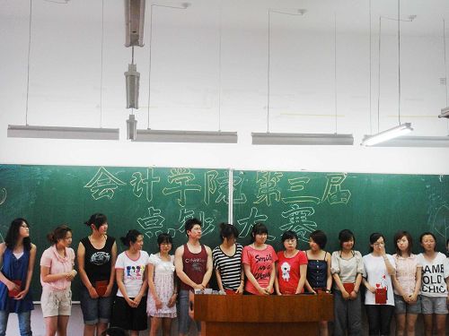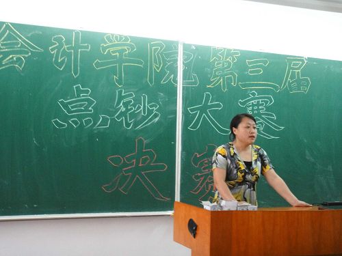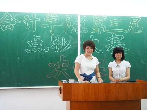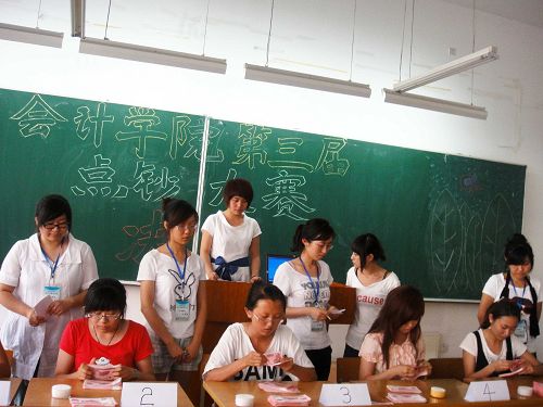 2010年6月10日下午16时30分,由会计学院学生会学习部举办的点钞大赛决赛在3103教室里进行,到场的嘉宾有会计学院学生会党总支书记陈慧华教授,赵世杰老师,辅导员王博老师、杨贞老师,会计学院学生会主席朱震,学生会行政中心主任祖超。