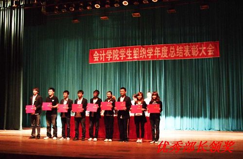 表彰大会由党总支副书记赵世杰老师主持。大会伊始,首先是杨贞老师和郑磊老师宣读优秀部长和优秀部员名单,有27人被评为“优秀部长”,56人被评为“优秀部员”,受表彰的学生干部共83名。学院为表彰他们在一年里为学院学生工作做出的贡献,向他们颁发了荣誉证书,并号召大家以他们为榜样,将会计学院学生组织的光荣传统和努力工作的精神传承和发展下去。优秀学生干部代表的发言,更是真诚的表达了学生组织全体成员内心的骄傲和自豪。