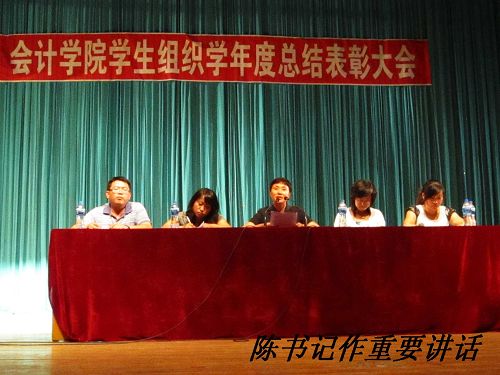 为了树立榜样、表彰先进、促进学生工作更好地发展,2010年6月21日下午4点20分,会计学院学生组织年度总结表彰大会在学校东区大礼堂隆重举行,参加本次会议的有会计学院党总支书记陈慧华教授,党总支副书记赵世杰老师,辅导员王博老师,杨贞老师,郑磊老师以及会计学院六大学生组织全体成员。