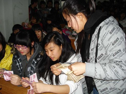 期间,朱震主席在热心巡视了同学们的练习情况后,更是亲身体验了点钞的乐趣。07级学姐们的精彩展示博得了大家一阵阵喝彩。07级学姐竟然令一摞简单的钞票瞬间绽放为一朵鲜花,而且她们点钞的速度毫不逊色于点钞机,这震惊了全场,所有人都叹为观止!