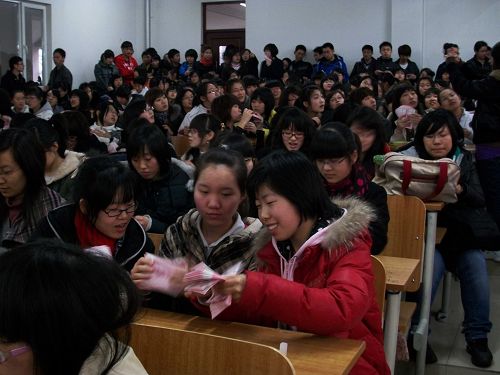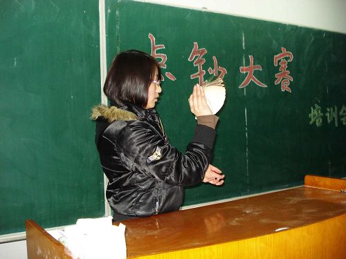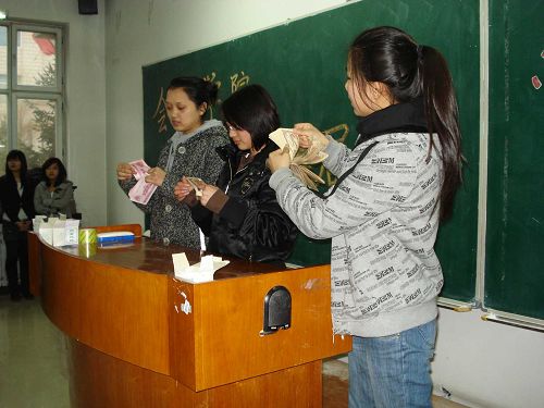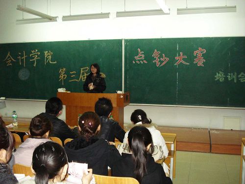 2010年3月31日下午四点三十分,在经过精心准备后,会计学院第三届点钞大赛培训会在新区3101教室隆重召开。出席本次培训会有会计学院学生会主席朱震,副主席王泽、王聪及学生会工作人员和参加培训会的09级学生,此次培训大会还邀请到了07级会计教育的魏丽娜、张宏杨、程瑞雪三位点钞高手。