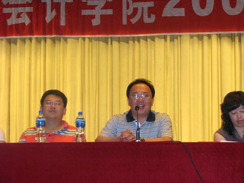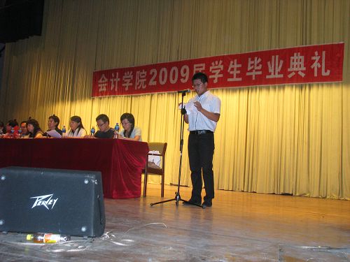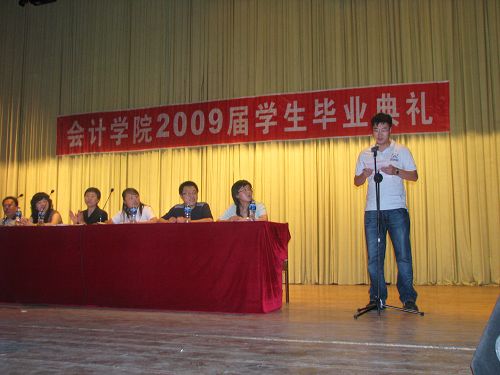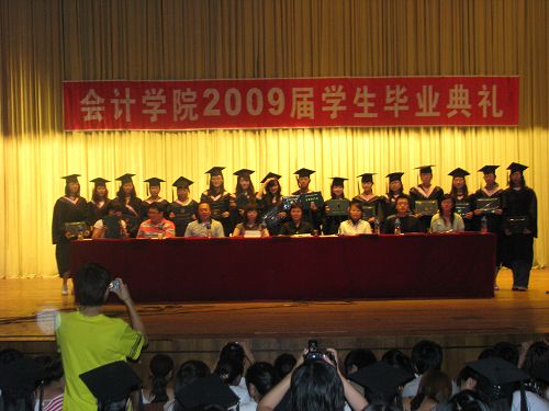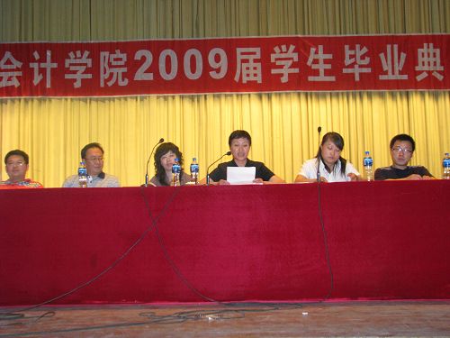2009年6月26日下午13:30分,会计学院2009届学生毕业典礼在学校东区大礼堂隆重举行。会计学院党总支书记陈慧华教授、会计学院副院长张劲松教授、副院长张林教授、辅导员王博老师、金福吉老师、杨贞老师、郑磊老师以及会计学院2009届全体毕业生出席了本次典礼。毕业典礼由会计学院党总支副书记赵世杰老师主持。