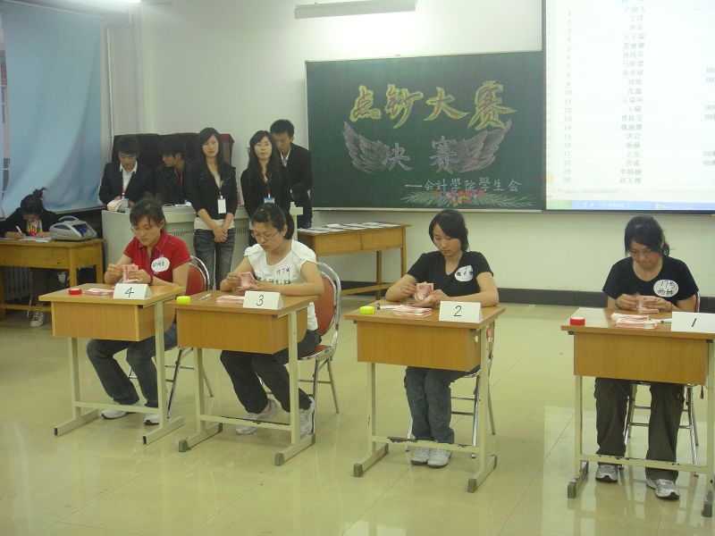 为加强学风建设,拓展学生基本素质,提高学生实践动手能力,针对当前市场竞争激烈,就业形势日益严峻的局面,会计学院第二届点钞大赛于5月如期举行。经过了初赛、复赛近一个月的选拔,最终选出了20名选手参加5月20日晚16:30在1408举行的决赛。会计学院党总支书记陈慧华教授、副院长张劲松教授、副院长张林教授、副书记赵世杰老师、08级辅导员王博老师、07级辅导员金福吉老师以及郑磊老师、常纪锋老师出席了这次大赛。