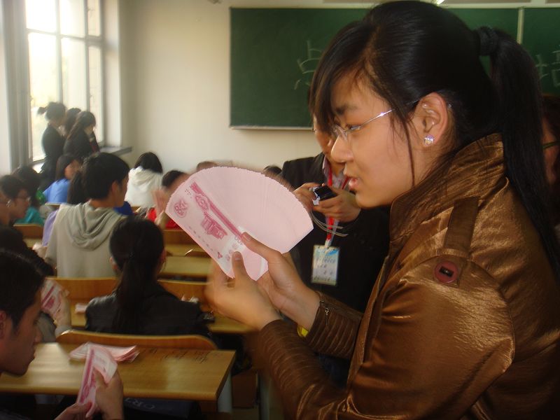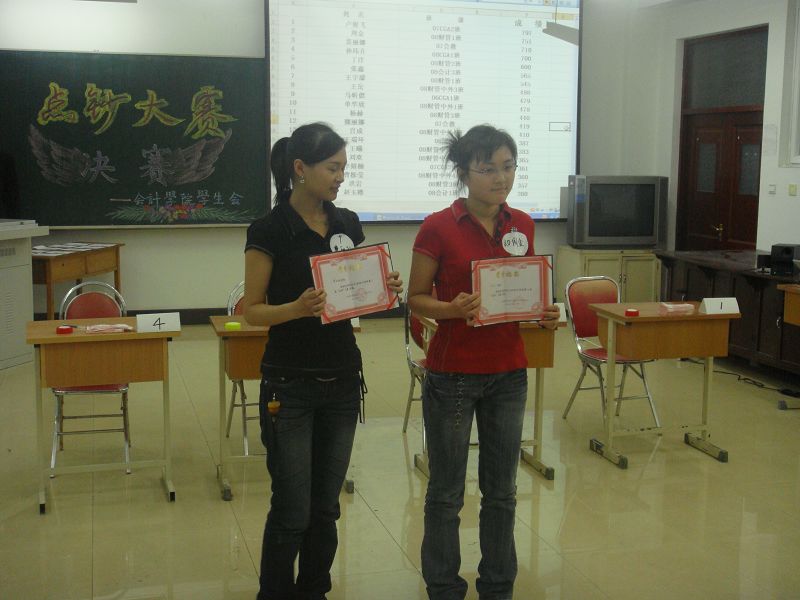 此次大赛以一组真实的Flash拉开帷幕,它记录了同学们从初赛到复赛的点点滴滴;记录了选手们刻苦练习的分分秒秒;也记录了选手们参加比赛的成长历程。在比赛过程中,选手们分别使用单手单张、五指抓挠(多指多张)、单手扇面和双手扇面等专业手法进行了精准的点钞,评委们与现场观众赞叹不已。经过基础点钞、干扰点钞、游戏抢椅子和考查记忆力等环节,07级CGA2班的卢俊飞、08级财务管理一班的周金和07级会计教育的裴丽娜同学分别获得了此次大赛的冠、亚、季军。赛后,党总支书记陈慧华教授、副院长张劲松教授、张林教授和赵副书记分别做了点评,指出点钞大赛是我院推动实践教学的重要组成部分,有助于提高同学们的实践动手能力,希望我们在不久的将来能够成为“综合应用型人才”,并在就业问题上拔得头筹。