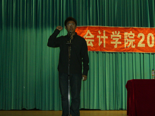 正式开会之前,在院学生会主席孙亚光同学的带领下,我院2007级全体同学进行了入学宣誓,“做商大人,我们无怨无悔……我们愿做……”,在严肃的气氛下,通过铿锵有力的誓言表明了成为优秀大学生的决心。