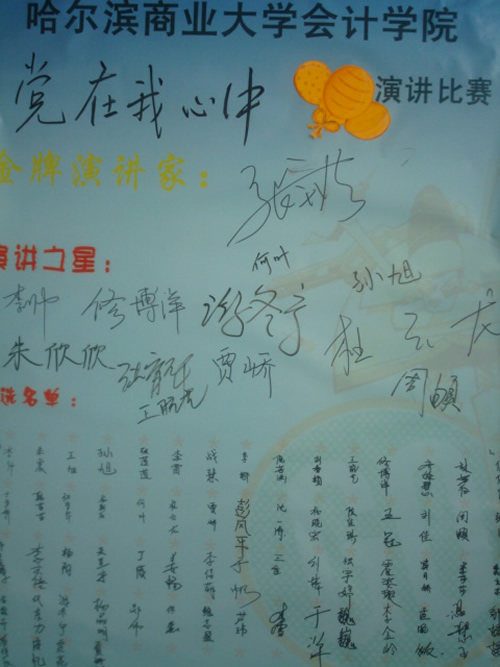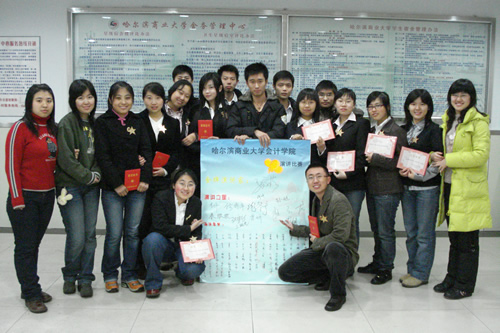 经过激烈的角逐,最后07级财务管理一班张宇婷同学获“哈尔滨商业大学会计学院金牌演讲家”荣誉称号;07级朱欣欣、修博洋、杜云龙、贾峤、王晓艺、张育华、李帅、何叶、游冬宁,06级周頔、孙旭十一位选手获“哈尔滨商业大学会计学院演讲之星”荣誉称号。