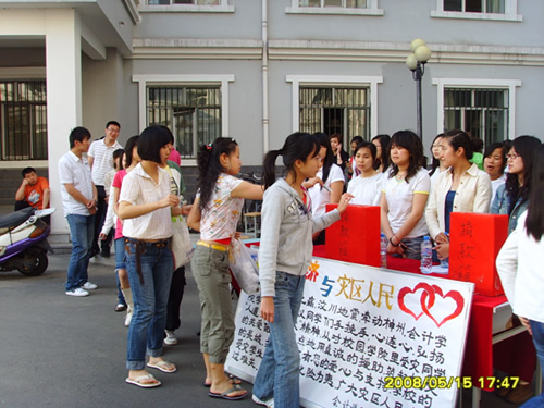 5月15日和16日下午,在会计学院16公寓楼下,由会计学院学生会、团委,舍务管理委员会,党员活动站和秘书处联合举行了“举国同心,守望相助,用心凝聚,将爱传播”抗震救灾捐款活动。一排捐款箱前排起了长长的队伍,会计学院全体学生纷纷献出自己的爱心,表达对灾区人民的一片关爱与祝福。同学们的捐款从百元到几十元,真心地被放到了捐款箱中。一名不愿意透露姓名的大一同学说:“昨天没有去献血很遗憾,今天捐款希望能表达自己的心情。”同学们踊跃捐款的场面真的很感人,充分表现了会计学院学子的爱心和社会责任感,希望灾区的人民尽快脱离困境。这两天我院学生共募集善款8000余元,这笔满载着哈尔滨商业大学会计学院师生的爱心捐款,将被寄往中国慈善总会。