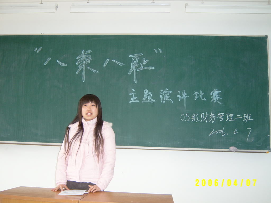 2006年4月7日,会计学院2005级财务管理二班在1307教室召开了以“八荣八耻”为主题的演讲比赛。