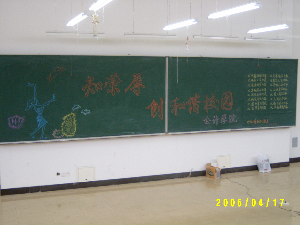 2006年4月17日下午,会计学院05级财务会计教育两个班的同学在4210教室举办了一场别开生面的以“知荣辱,创和谐校园”为主题的团活。参加此次主题团活的有学生工作督导刘老师、姚老师,院党总支书记陈慧华老师,院团委书记赵世杰老师,班主任哈今华老师,以及负责主题团活评比的院团委学生干部。