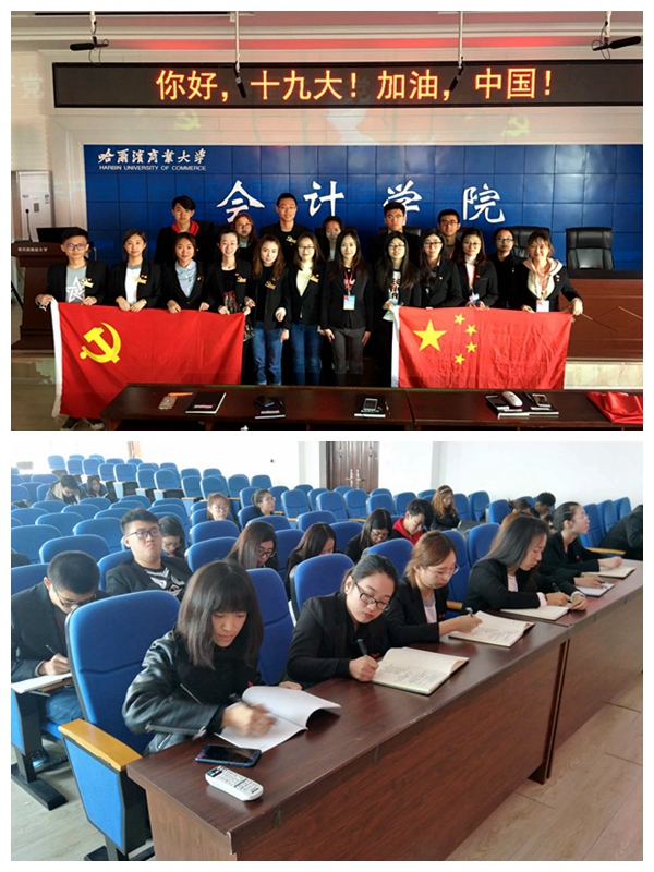 2017年10月18日上午,会计学院党委副书记刘天副教授、学生党员活动站全体成员以及17级财务管理各班班委,在1501会议室观看了党的十九大开幕会议直播盛况。