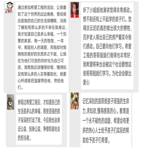 活动中,大家观看了《希望在你身边》宣传片,参观了黑龙江省希望工程文化室;通过基金会老师的讲解,同学们了解了黑龙江省希望工程实施25周年以来关于爱和希望的故事;在得知百岁爱心老人张庆云为教育奉献的感人故事后,对黑龙江省希望工程有了更深层的了解,感慨不断,有些同学甚至流下了感动的泪水。参观以后同学们认真写下了自己对这次活动的深刻体会,大家对黑龙江省青少年发展基金给予这次参观学习的机会表达了感谢,并要在今后积极参与黑龙江省希望工程的公益活动,尽自己的绵薄之力,帮助更多的人。