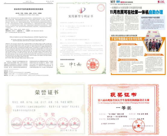 项目展示成果丰富,有一些创新实物、实用新型专利、中文核心期刊论文、第十一届全国大学生创新创业年会上作学术报告证书、第八届山鹰杯全国大学生包装创新结构设计大赛一等奖,还有哈尔滨生活报对项目成果采访的新闻报道。