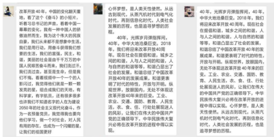 而后集体观看了《奋斗》微视频及习近平总书记在“庆祝改革开放四十周年大会”上的讲话。在《奋斗》微视频中重温中国共产党从诞生,到带领中国人民进行社会主义建设和改革开放,开创中国特色社会主义道路的波澜壮阔的历程,同学们感受到奋斗的艰辛、也体会到奋斗的幸福,新时代是奋斗者的时代,实现中国梦需要每位国人付出辛勤劳动。在改革开放四十周年庆祝大会上,总书记话语铿锵告诉我们“不忘初心,牢记使命,将改革开放进行到底,不断实现人民对美好生活的向往,在新时代创造中华民族新的更大奇迹!创造让世界刮目相看的新的更大奇迹!”习近平总书记的一番话彰显了改革决心,昭示了开放信念,在40周年这个重要时间节点上,必将凝聚起实现中华民族伟大复兴的磅礴力量。会后各位党员在微信平台上发表了观看视频后的感想体会,立志要当一名优秀的共产党员,牢记身份,牢记使命,在以后的学习工作中,要解放思想、实事求是、敢于创新、开放心态,发挥党员作用,做模范,做合格共产党员!